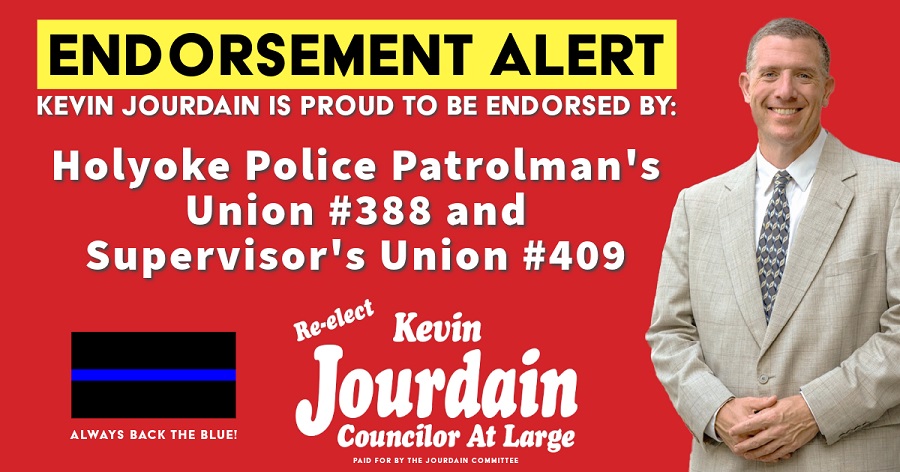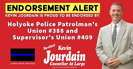 Holyoke City Councilor At Large Kevin Jourdain announced today that his campaign for reelection has been officially endorsed by Holyoke's two police officer unions.